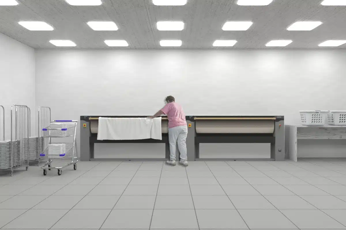 Dimensioni macchina ottimizzate, conca in acciaio lucidato per uno stiro anti-grinze, facilità di introduzione della biancheria, sicurezza dei nostri mangani garantita dal sistema di sbloccaggio conca a leva manuale, fungo di emergenza e funzione di sollevamento conca a pedale.
